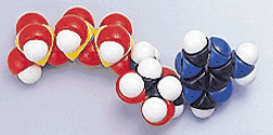 La structure de la molécule d'ATP est présentée ci-contre.On y reconnaît trois groupes "phosphate" PO4 dans la partie gauche du schéma. En cliquant sur le schéma de la molécule d'ATP, vous pourrez observer la molécule en trois dimensions (attention, un programme complémentaire au navigateur est nécessaire).